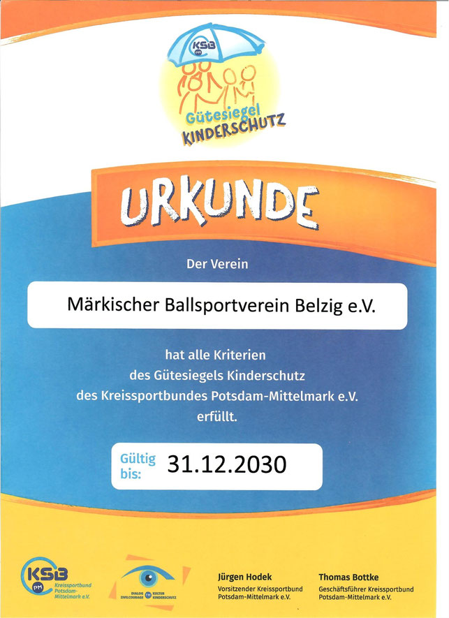 Unser Verein arbeitet nach den Richtlinien des Gütesiegels "Kinderschutz" des Kreissportbundes Potsdam-Mittelmark.